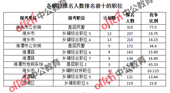 為幫助廣大考生更清晰的了解報名情況,中公網校整理了湘潭市各職位的報名人數(shù)排名以及競爭比例排名,供廣大考生參考: