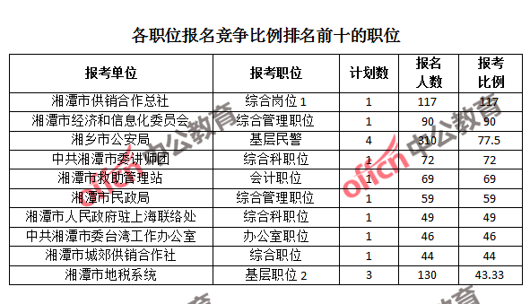 競爭熱門職位,前三位依次是:湘潭市供銷合作總社綜合崗位1(競爭比例117:1)、湘潭市經濟和信息化委員會綜合管理職位(競爭比例90:1)和湘鄉(xiāng)市公安局基層民警(競爭比例77.5:1)。