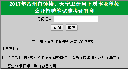 2017江蘇常州市鐘樓、天寧衛(wèi)計(jì)局下屬事業(yè)單位招聘筆試準(zhǔn)考證打印入口