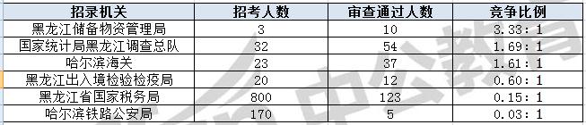 截止到30日18時,通過審核人數(shù)前三位的部門依次是:黑龍江省國家稅務局、國家統(tǒng)計局黑龍江調查總隊、哈爾濱海關,三部門通過審核總人數(shù)達214人,占通過審核總人數(shù)的88.8%。