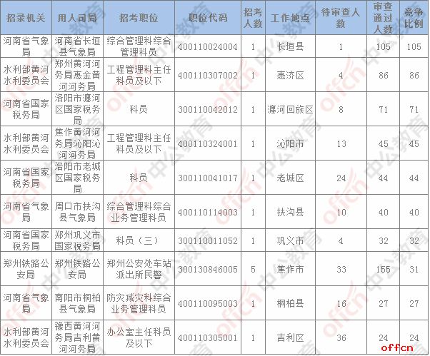 報(bào)名通過審核人數(shù)前十的職位主要集中在河南省國家稅務(wù)局、鄭州鐵路公安局、中國銀行業(yè)監(jiān)督管理委員會(huì)河南監(jiān)管局、水利部黃河水利委員會(huì)等部門,具體信息如下: