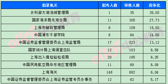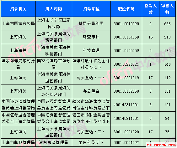 報(bào)名通過審核人數(shù)前十的職位主要集中在上海市國家稅務(wù)局、上海海關(guān)等部門,具體信息如下: