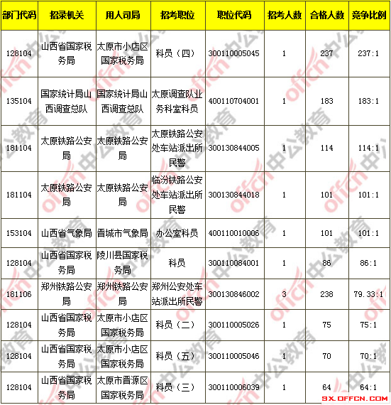 報(bào)名通過審核人數(shù)前十的職位主要集中在鄭州鐵路公安局、山西省國家稅務(wù)局、國家統(tǒng)計(jì)局山西調(diào)查總隊(duì)等部門,具體信息如下: