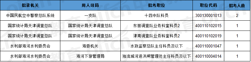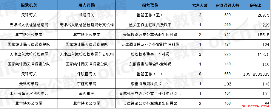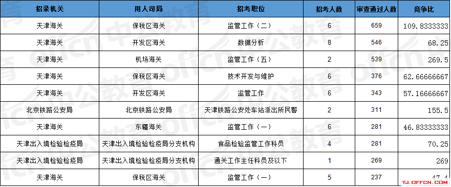 報名通過審核人數(shù)前十的職位主要集中在天津海關(guān)、北京鐵路公安局、天津出入境檢驗檢疫局等部門,具體信息如下: