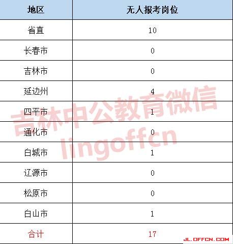2018吉林公務(wù)員考試報名已結(jié)束,共計17崗位無人問津。省直崗位居多,共10個崗位無人報名,長春市、吉林市、通化市、松原市、遼源市無人報考崗位為零。詳情如下表:
