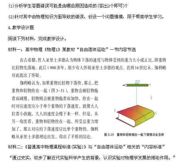 (1)簡(jiǎn)要分析材料一內(nèi)容在“自由落體運(yùn)動(dòng)”一節(jié)中的作用