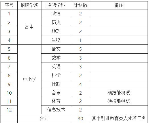 1.本次招聘計劃數(shù)暫設(shè)30名,招聘計劃中的學(xué)段設(shè)置、學(xué)科設(shè)置和招聘人數(shù)可根據(jù)報名人數(shù)、生源質(zhì)量等具體情況而作相應(yīng)調(diào)整。