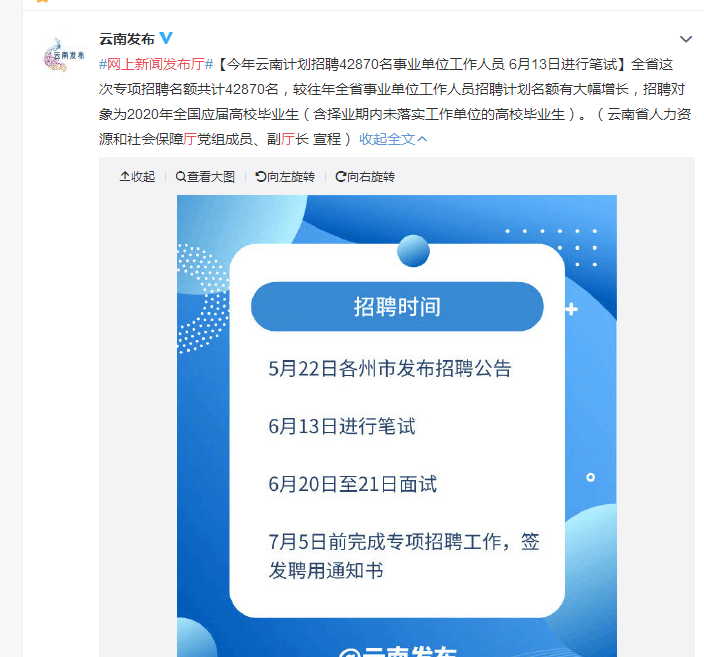 2020云南事業(yè)單位招聘考試有消息了,近日在中共云南省委宣傳部官方微博發(fā)布了一條關(guān)于2020云南事業(yè)單位招聘考試的消息,里面明確提到今年云南計劃招聘42870名事業(yè)單位工作人員 6月13日進行筆試,全省這次專項招聘名額共計42870名,較往年全省事業(yè)單位工作人員招聘計劃名額有大幅增長,招聘對象為2020年全國應(yīng)屆高校畢業(yè)生(含擇業(yè)期內(nèi)未落實工作單位的高校畢業(yè)生)。以下是官方發(fā)布信息的截圖。