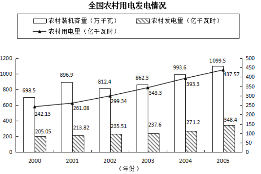 2.根據(jù)上圖,下列關(guān)于我國(guó)農(nóng)村用電發(fā)電情況的表述,錯(cuò)誤的一項(xiàng)是( )。