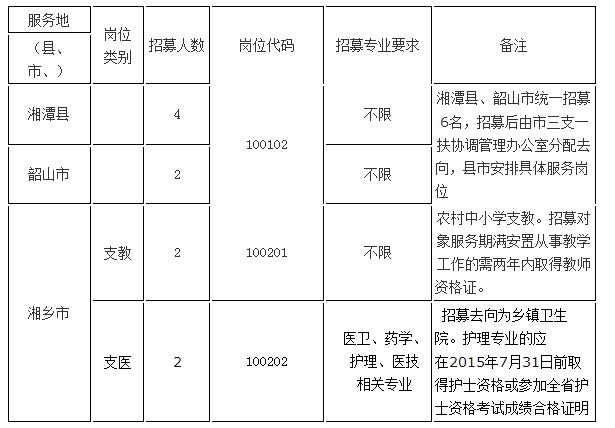 2015年全市“三支一扶” 招募計(jì)劃為10名,其中湘潭縣4名、湘鄉(xiāng)市4名、韶山市2名。
