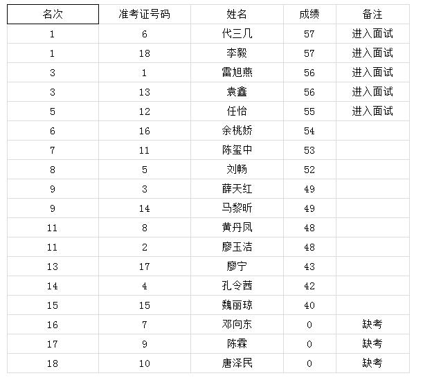 根據(jù)中共雅安市委組織部、雅安市人力資源和社會局《關(guān)于雅安市2015年公開考核招聘事業(yè)單位高學(xué)歷和急需專業(yè)人員的公告》相關(guān)規(guī)定,我局組織的筆試工作已經(jīng)結(jié)束?,F(xiàn)將筆試成績及進入面試人員名單公示如下,具體面試時間另行電話通知。