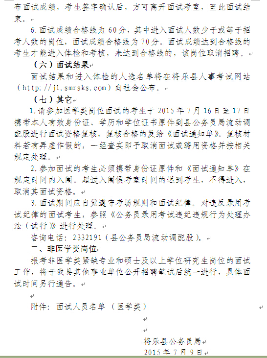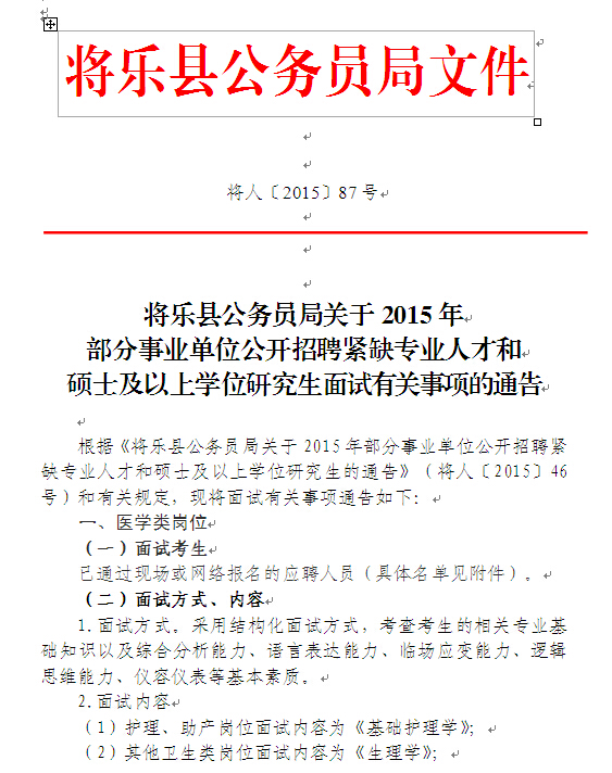 2015福建將樂縣事業(yè)單位招聘緊缺專業(yè)人才和碩士及以上學位研究生面試公告
