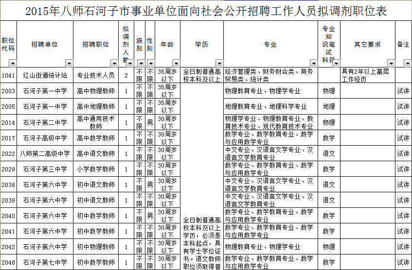 2015年八師石河子市事業(yè)單位面向社會公開招聘工作人員工作已經(jīng)基本結(jié)束,根據(jù)《2015年八師石河子市事業(yè)單位面向社會公開招聘工作人員簡章》關(guān)于招聘調(diào)劑工作的規(guī)定:招聘崗位出現(xiàn)空缺的,經(jīng)招聘單位主管部門申請可以進行調(diào)劑。調(diào)劑只在符合空缺崗位條件且面試成績及格的考生中按照總成績高低進行調(diào)劑?,F(xiàn)擬對此次招聘工作中部分空缺職位進行調(diào)劑。