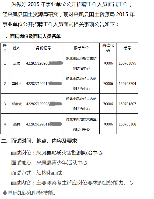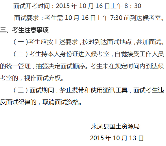 2015湖北來鳳縣國土資源局事業(yè)單位招聘面試公告