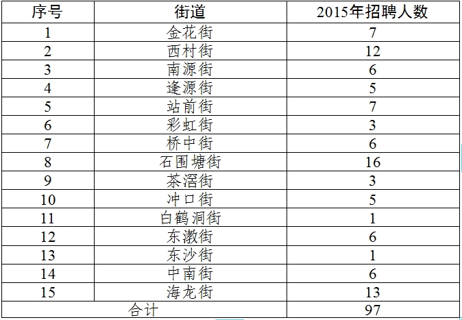 本次招聘社區(qū)居委會(huì)專(zhuān)職工作人員97名,每位報(bào)考人員只能報(bào)考1個(gè)街道,報(bào)考2個(gè)街道或以上的人員將取消考試資格。