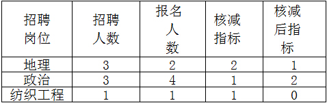 根據(jù)《天臺縣教育局 天臺縣人力資源和社會局 關(guān)于天臺縣教育局校園招聘2016屆高校畢業(yè)生的公告》規(guī)定,“報名人數(shù)與錄用崗位須達到 2∶1及以上的比例方可開考,未達比例的相應(yīng)核減錄用指標或不開考。”經(jīng)研究,決定對以下錄用崗位指標進行核減。
