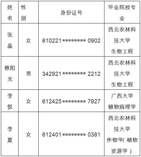 根據(jù)《安康市農業(yè)局關于市農業(yè)科學研究所、市畜牧獸醫(yī)中心2016年公開招聘碩士研究生工作方案》,通過公開報名、資格審查、面試、體檢、考察等環(huán)節(jié),確定張晶等4名同志為安康市農業(yè)科學研究所2016年公開招聘碩士研究生擬聘用人員,現(xiàn)進行公示。