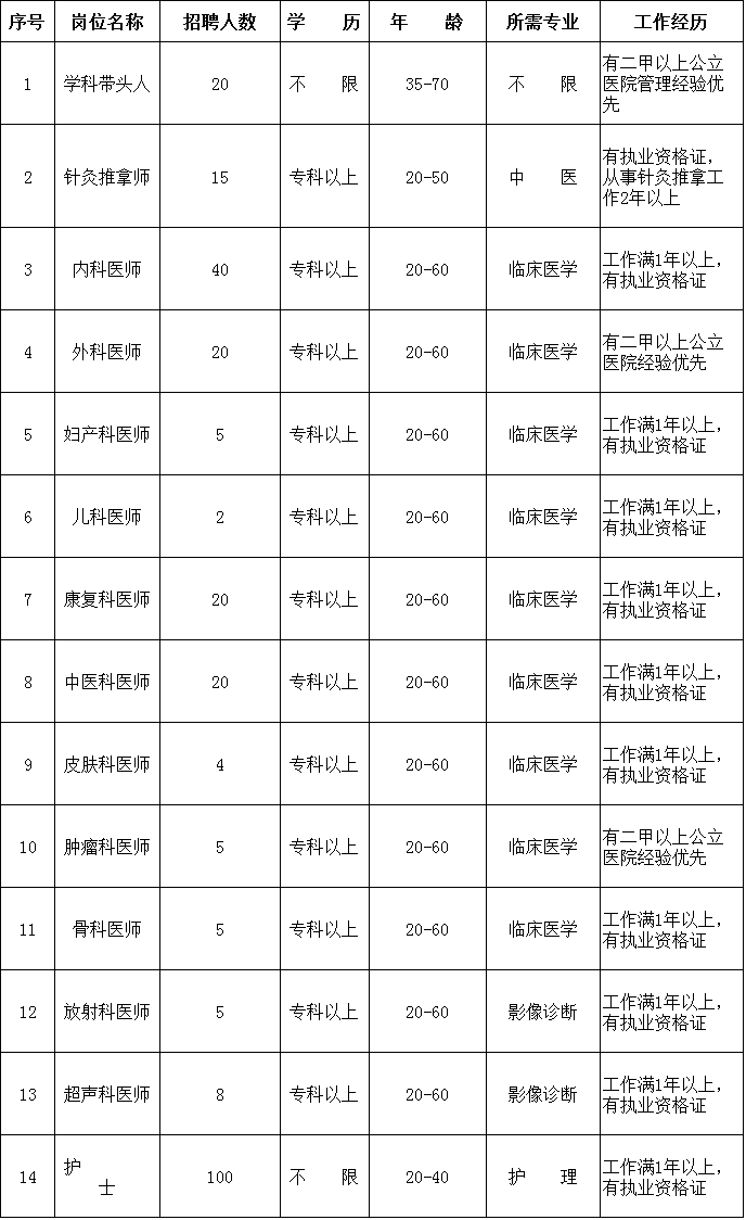 本次招聘臨床、針灸推拿、超聲、護(hù)理3個(gè)專業(yè)技術(shù)崗位。(具體條件詳見附表)。
