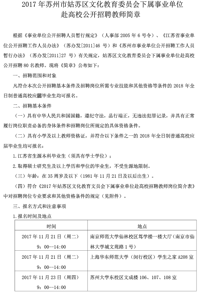2017江蘇蘇州市姑蘇區(qū)文化教育委員會下屬事業(yè)單位赴高校招聘教師公告【招80人】
