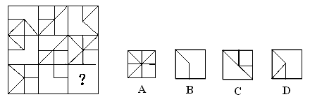 (解答:每行前兩個(gè)圖形疊加后,不同的部分就是第三個(gè)圖形。正確答案是D。)
