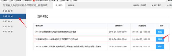 注冊后登錄甘肅省人力資源和社會廳網(wǎng)上報名系統(tǒng),點擊左上角“當前考試”,點擊“武威市2018年事業(yè)單位公開招聘考試”。