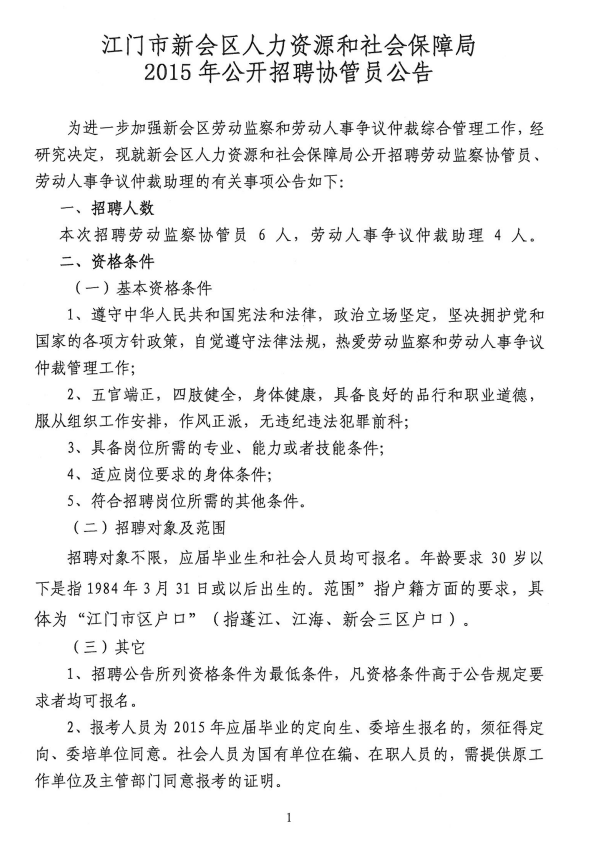 2015年廣東省江門市新會區(qū)人力資源和社會局招聘協(xié)管員10人公告