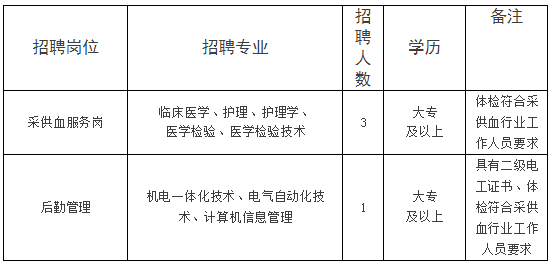 因業(yè)務(wù)發(fā)展需要,嘉興市中心血站決定公開招聘編外合同制人員4名,現(xiàn)將公開招聘有關(guān)事項公告如下: