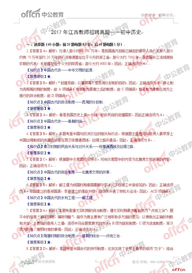 2017年江西教師招聘《初中歷史》試題答案及解析
