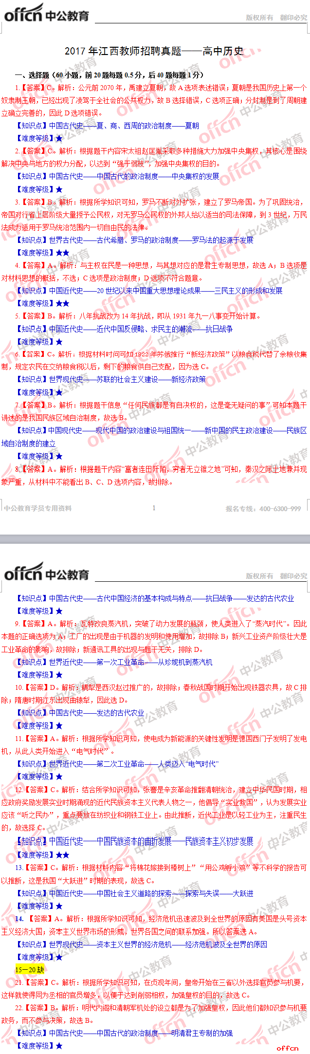 2017年江西教師招聘《高中歷史》試題答案及解析