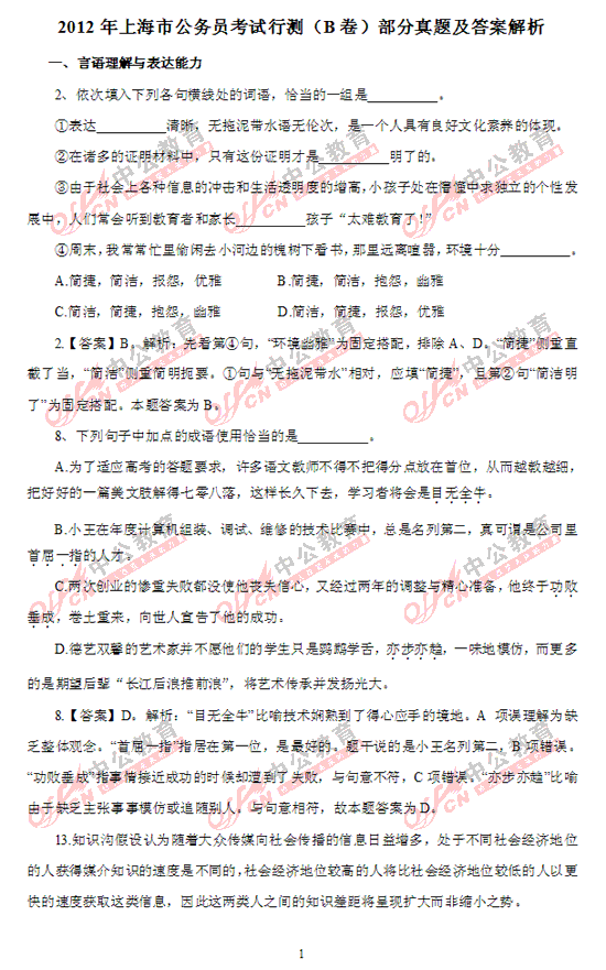 2012年上海市公務(wù)員考試行測(cè)(B卷)部分及答案解析