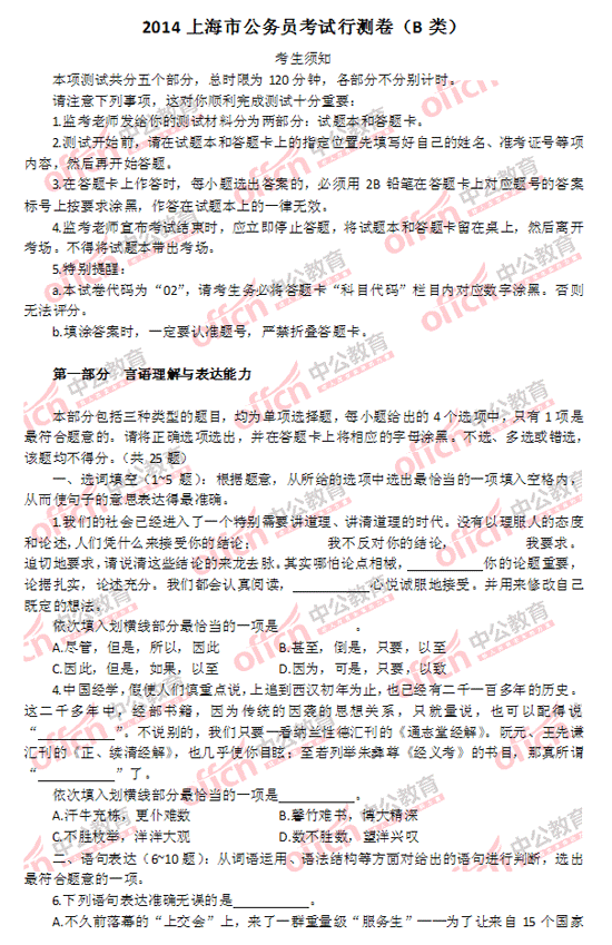 2014上海市公務(wù)員考試行測(cè)(B類)