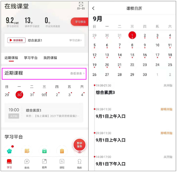 操作:課程模塊,點(diǎn)擊“查看課表”可查看近期課程安排,點(diǎn)擊課程可快捷進(jìn)入直播或觀看直播回放內(nèi)容。