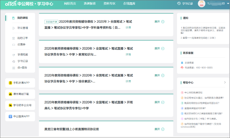 (1)登錄后默認(rèn)展示“我的課程”,中間區(qū)域顯示已經(jīng)開通的網(wǎng)課列表。