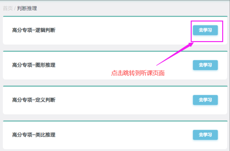 (3)按照目錄進(jìn)行選擇,點(diǎn)擊“去學(xué)習(xí)”,可進(jìn)入對應(yīng)該科目的聽課頁面。