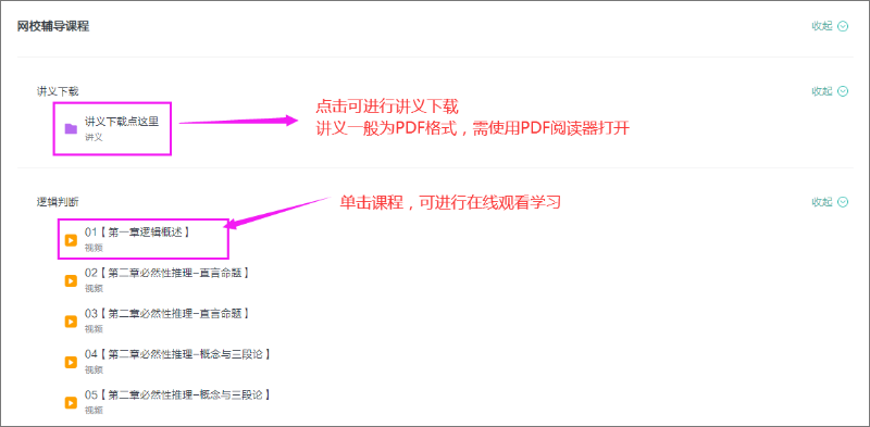 (4)聽課學(xué)習(xí):進(jìn)入聽課頁面,可下載電子講義,或單擊課程進(jìn)行在線觀看學(xué)習(xí)。