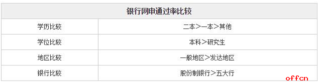 最后從銀行方面比較,五大行的網(wǎng)申相對較難,股份制銀行更容易通過。