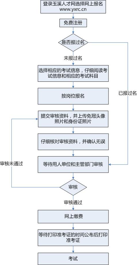 網(wǎng)絡(luò)報名的大致流程為:登錄玉溪人才網(wǎng)→網(wǎng)上報名入口→注冊→查看招聘崗位→按崗位報名并填寫報名資料→等待審核→審核通過→網(wǎng)上交費(注意查看交費狀態(tài),確認(rèn)交費)→打印筆試準(zhǔn)考證(打印時間在筆試公告內(nèi)另行通知)→參加筆試。