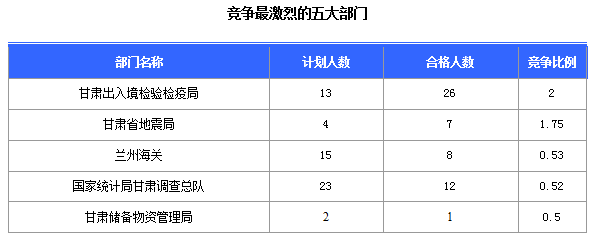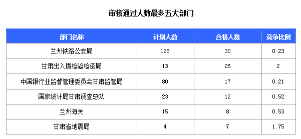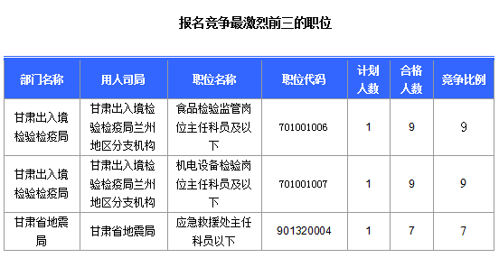 報(bào)名通過審核人數(shù)前五的職位主要集中在甘肅省出入境檢驗(yàn)檢疫局、甘肅省地震局、蘭州海關(guān)等部門,具體信息如下: