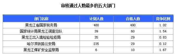 截止15日17時(shí),通過審核人數(shù)前三位的部門依次是:黑龍江省國家稅務(wù)局、國家統(tǒng)計(jì)局黑龍江調(diào)查總隊(duì)、黑龍江出入境檢驗(yàn)檢疫局,三部門通過審核總?cè)藬?shù)達(dá)579人,占通過審核總?cè)藬?shù)的91.9%。