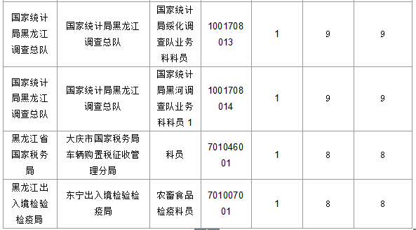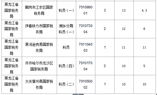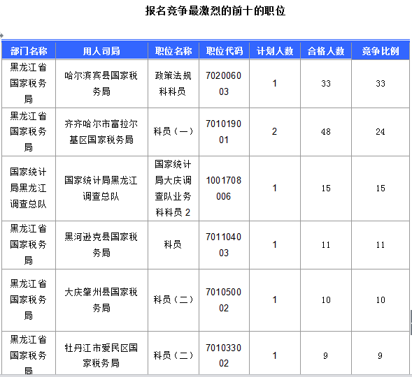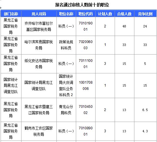 報名通過審核人數(shù)前十的職位主要集中在黑龍江省國家稅務(wù)局、國家統(tǒng)計局黑龍江調(diào)查總隊等部門,具體信息如下: