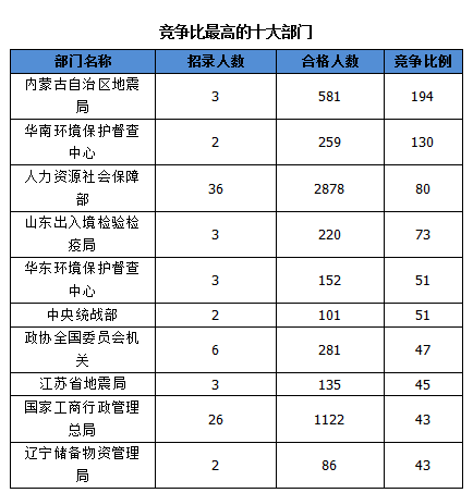 與上午九時數(shù)據(jù)相比,報名人數(shù)最多十大部門清一色為國稅部門,報名人數(shù)最多的山東國稅,招660人,共6404人報名,報名人數(shù)翻倍增長,目前競爭最激烈的部門是內(nèi)蒙古地震局,招錄3人,已經(jīng)有581人報名,成為截止目前最“擁堵”的部門。