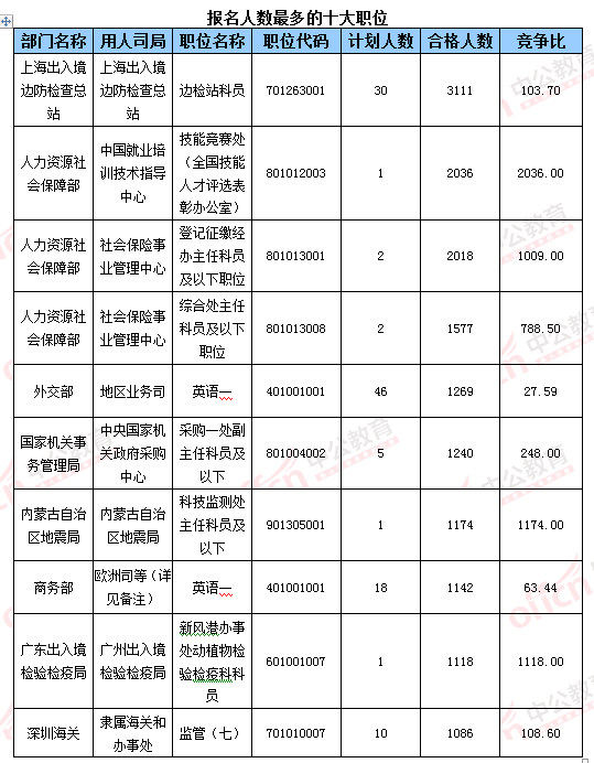 “人力資源社會(huì)部中國(guó)就業(yè)培訓(xùn)技術(shù)指導(dǎo)中心”職位競(jìng)爭(zhēng)比2000:1,是第二名“內(nèi)蒙古自治區(qū)地震局”職位的兩倍。隨著報(bào)名截止時(shí)間的臨近,該職位會(huì)成為本年度國(guó)考熱度職位無(wú)疑!