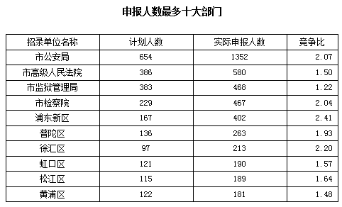 為幫助廣大考生更清晰的了解今日?qǐng)?bào)名情況,中公網(wǎng)校整理了實(shí)際申報(bào)人數(shù)前十位的部門以及競(jìng)爭比例最激烈的十大部門,供廣大考生參考: