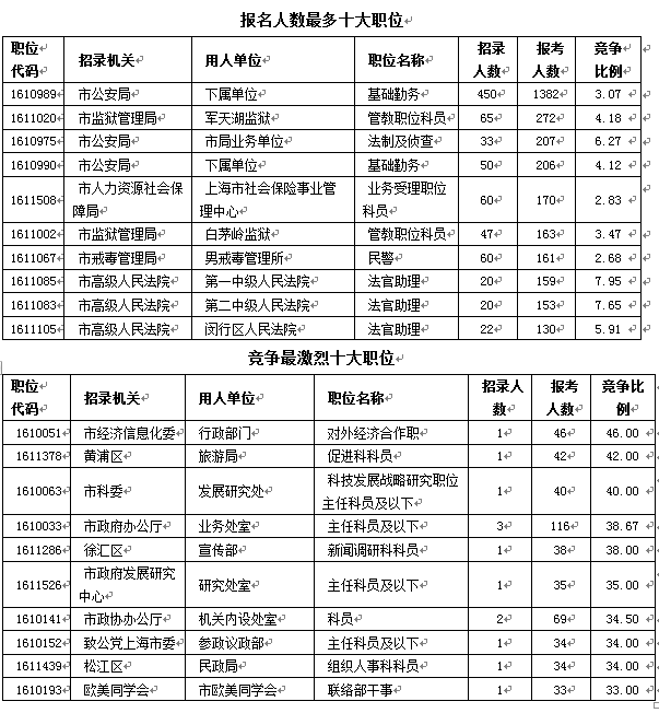 截至2月19日18時(shí),報(bào)名人數(shù)最多十大職位多數(shù)來(lái)自市公安局、市監(jiān)獄管理局、市高級(jí)人民法院三大部門(mén)。其中,市公安局與市高級(jí)人民法院均有三個(gè)職位上榜,市監(jiān)獄管理局也有兩個(gè)職位入圍,其中市公安局下屬單位基礎(chǔ)勤務(wù)(職位代碼1610989)這一職位的報(bào)名人數(shù)達(dá)到1382人,比亞軍位置的市監(jiān)獄管理局軍天湖監(jiān)獄管教職位科員一職高出1110人,冠壓群芳,這與該職位龐大的招錄人數(shù)有重大關(guān)系。