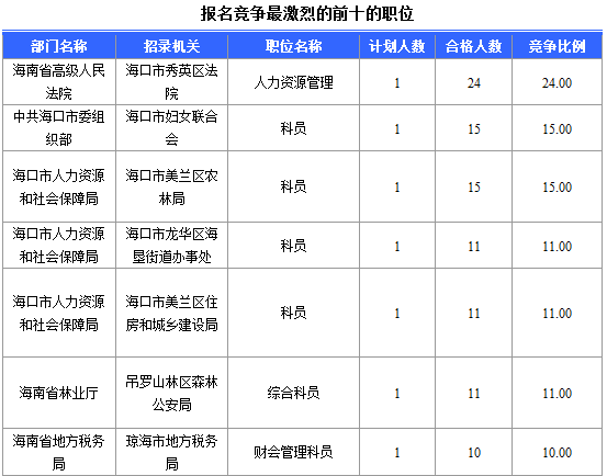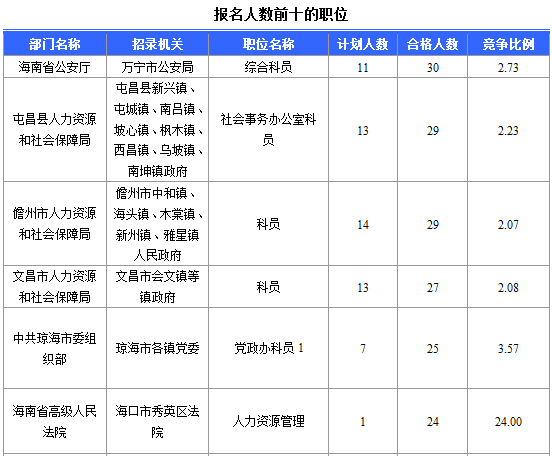 報(bào)名通過(guò)審核人數(shù)前十的職位主要集中在海南省高級(jí)人民法院、??谑腥肆Y源和社會(huì)局、海南省林業(yè)廳,具體信息如下: