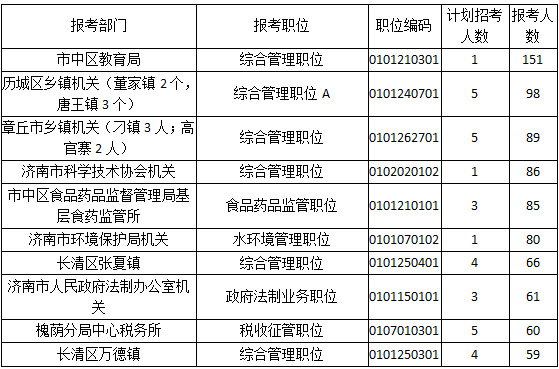 2016年山東省考濟(jì)南市所屬職位中,報考人數(shù)前三位的職位依次是:市中區(qū)教育局綜合管理職位、歷城區(qū)鄉(xiāng)鎮(zhèn)機(jī)關(guān)(董家鎮(zhèn)2個,唐王鎮(zhèn)3個)綜合管理職位A、章丘市鄉(xiāng)鎮(zhèn)機(jī)關(guān)(刁鎮(zhèn)3人;高官寨2人)綜合管理職位,報考人數(shù)分別是151、98、89。
