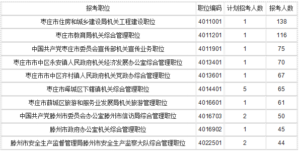 2016年省考報(bào)名棗莊地市所屬的職位中,報(bào)名人數(shù)前三位的職位依次是:滕州市安全生產(chǎn)監(jiān)督管理局滕州市安全生產(chǎn)監(jiān)察大隊(duì)綜合管理職位、滕州市政府辦公室機(jī)關(guān)綜合管理職位、中國共產(chǎn)黨滕州市委員會辦公室滕州市信訪局綜合管理職位,報(bào)考人數(shù)分別為138人、116人、75人。其中滕州市安全生產(chǎn)監(jiān)督管理局滕州市安全生產(chǎn)監(jiān)察大隊(duì)綜合管理職位競爭最為激烈,報(bào)名首日報(bào)考人數(shù):招考人數(shù)的比例已達(dá)138:1.