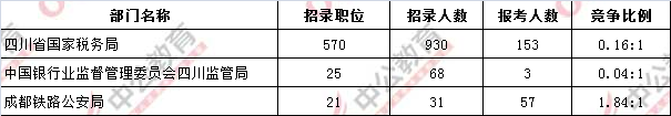 截止到15日16時,通過審核人數(shù)前三位的部門依次是:四川省國家稅務局,中國銀行業(yè)監(jiān)督管理委員會四川監(jiān)管局,成都鐵路公安局,三部門通過審核總?cè)藬?shù)達213人,除去以上三個部門外,其他部門暫無人通過審核