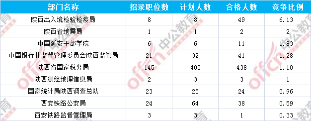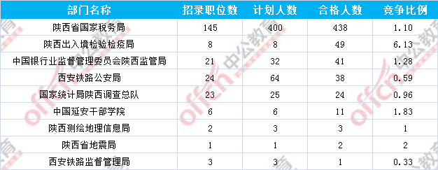 為幫助廣大考生更清晰的了解今日?qǐng)?bào)名情況,陜西中公網(wǎng)校整理了審核通過(guò)人數(shù)前幾位的部門(mén)以及競(jìng)爭(zhēng)比例最激烈的幾大部門(mén),供廣大考生參考: