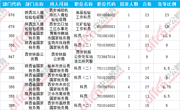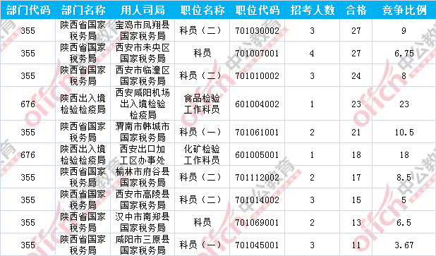 報(bào)名通過審核人數(shù)前十的職位主要集中在陜西省國家稅務(wù)局以及陜西出入境檢驗(yàn)檢疫局這兩個(gè)部門,具體信息如下: